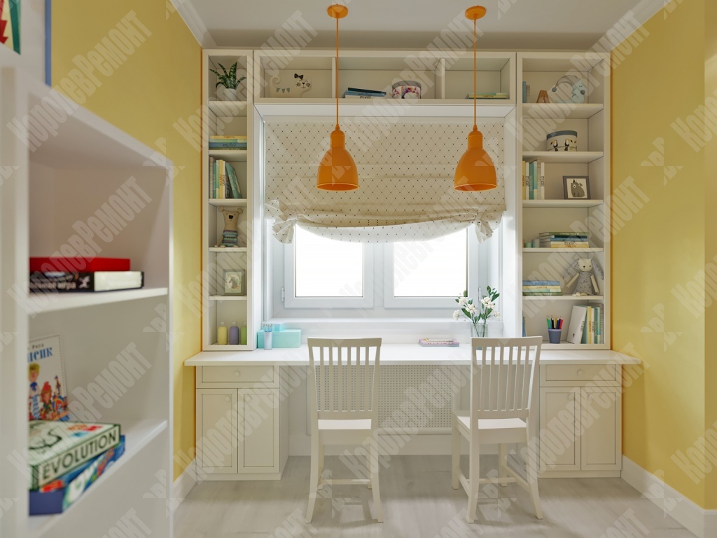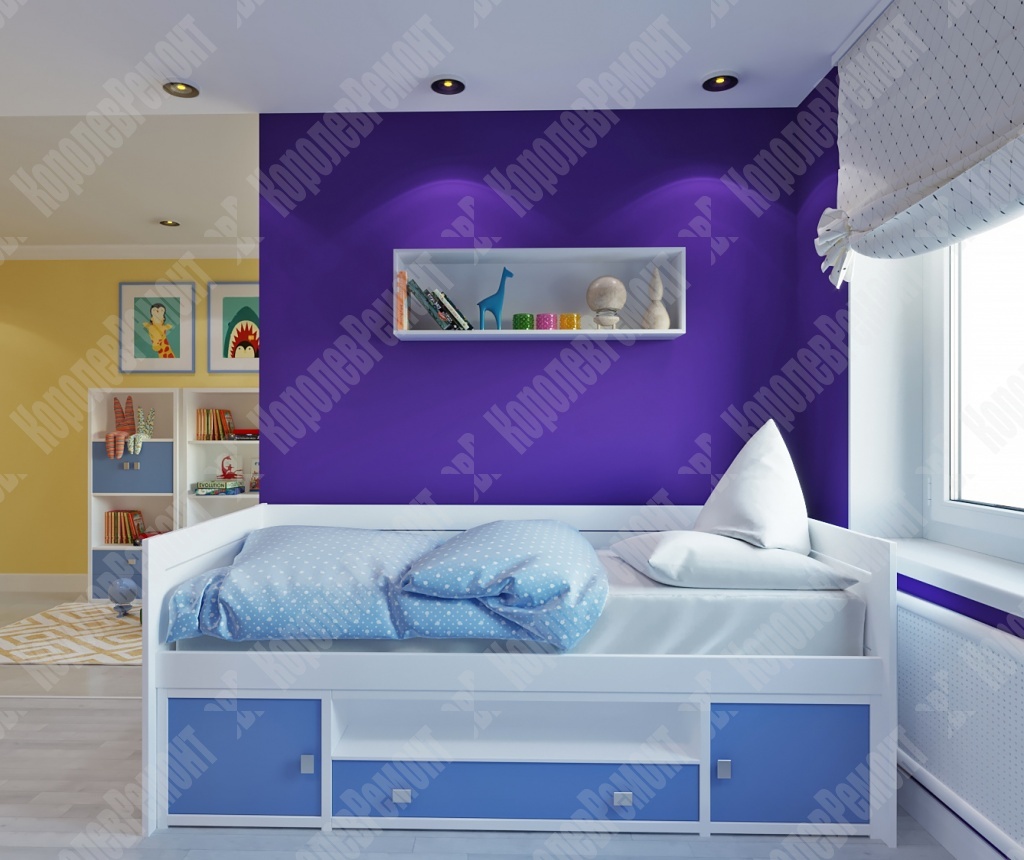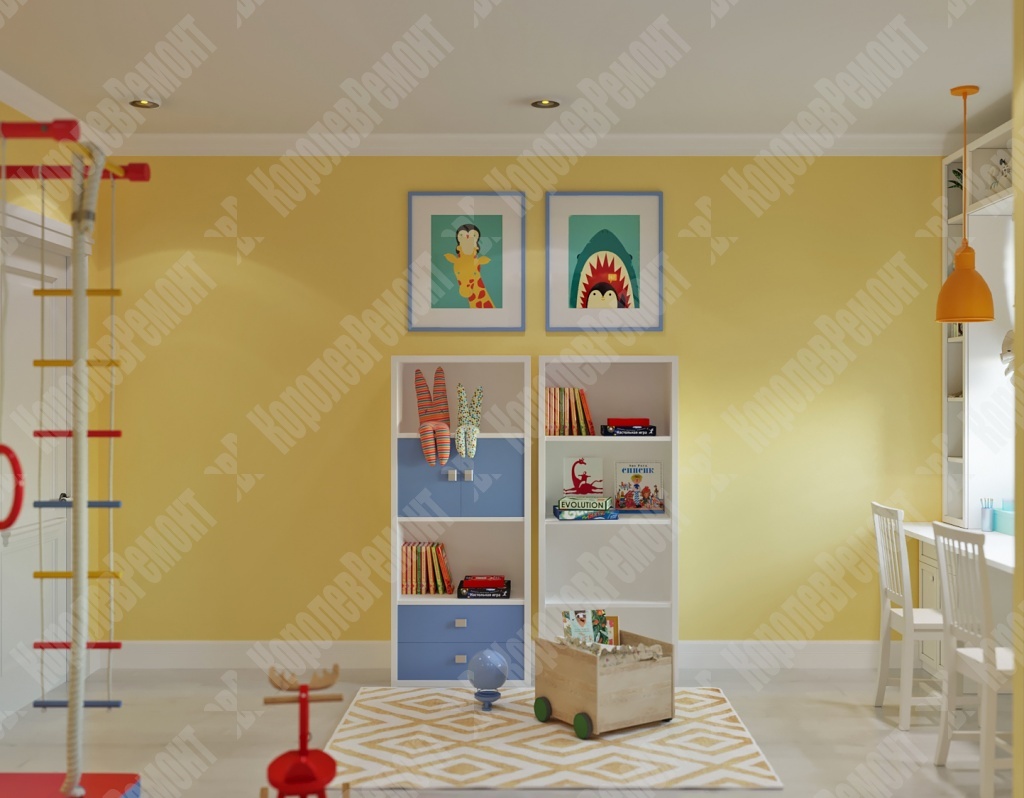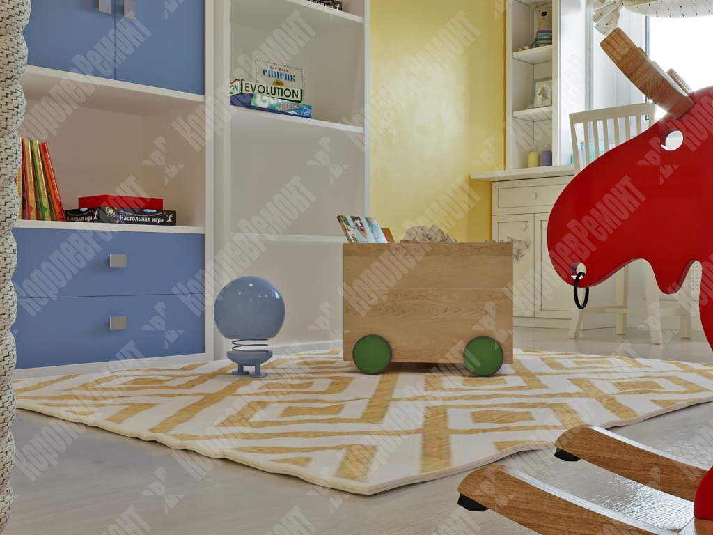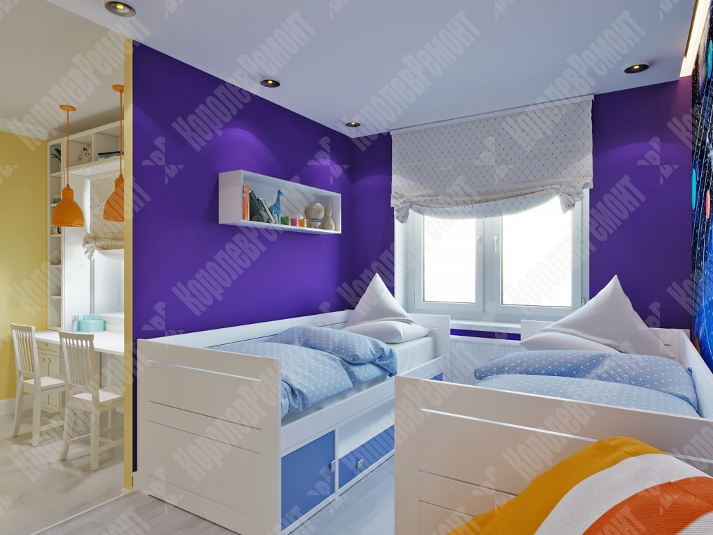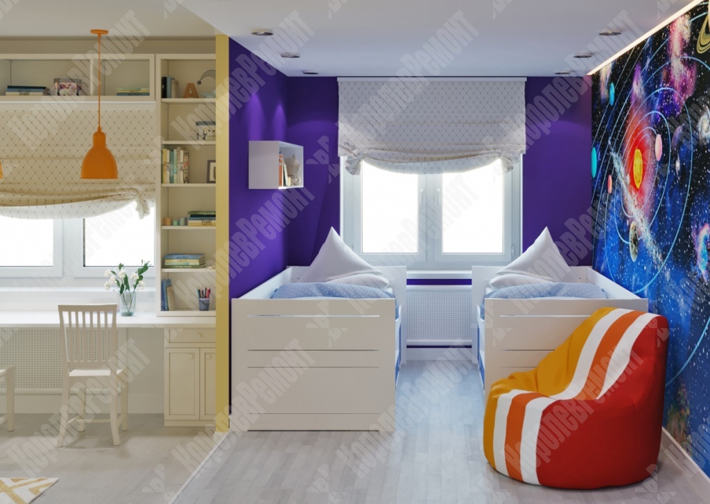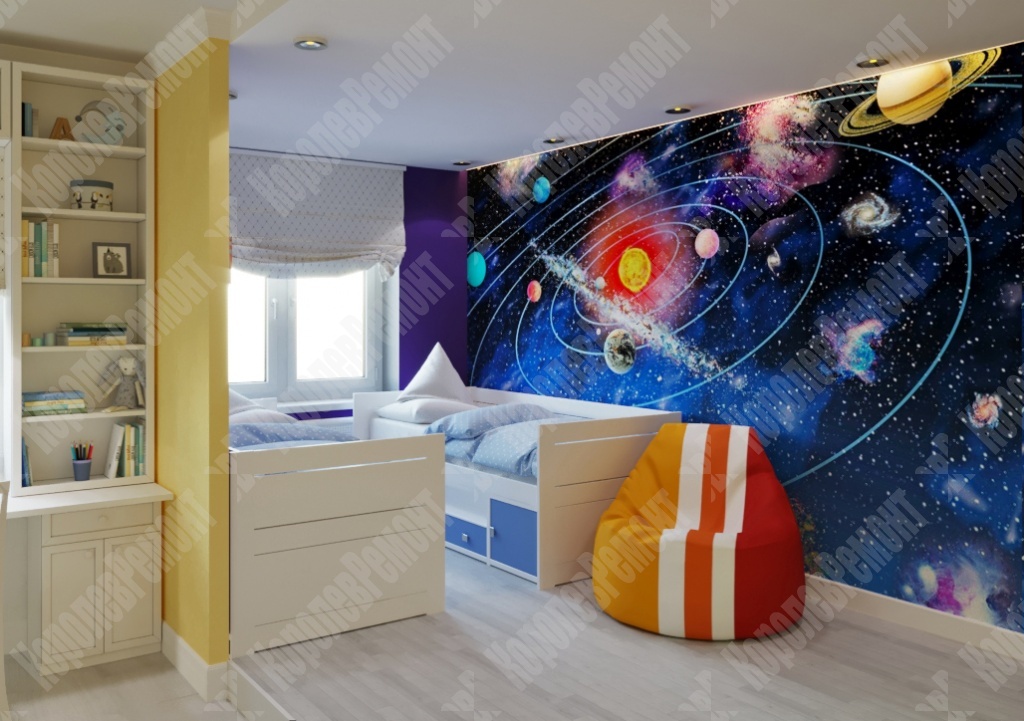 Все материалы в детской комнате натуральные, экологичные и безопасные для здоровья ребенка, что очень важно для детской комнаты в первую очередь. Одним из акцентов является стена, оформленная фотообоями с изображением солнечной системы. Не смотря на то что дети еще маленькие, родители не захотели оформлять фотообоями детскими картинками, так как в комнате будут жить и девочка, и мальчик, и подобрать какого-то персонажа было бы невозможно, так как, у каждого свои интересы и любимые герои. Но детей объединяет интерес к космосу, природе, что помогло сделать нам выбор в пользу первого. Остальная часть была окрашена. В итоге мы выполнили все пожелания заказчика, и все это было реализовано.